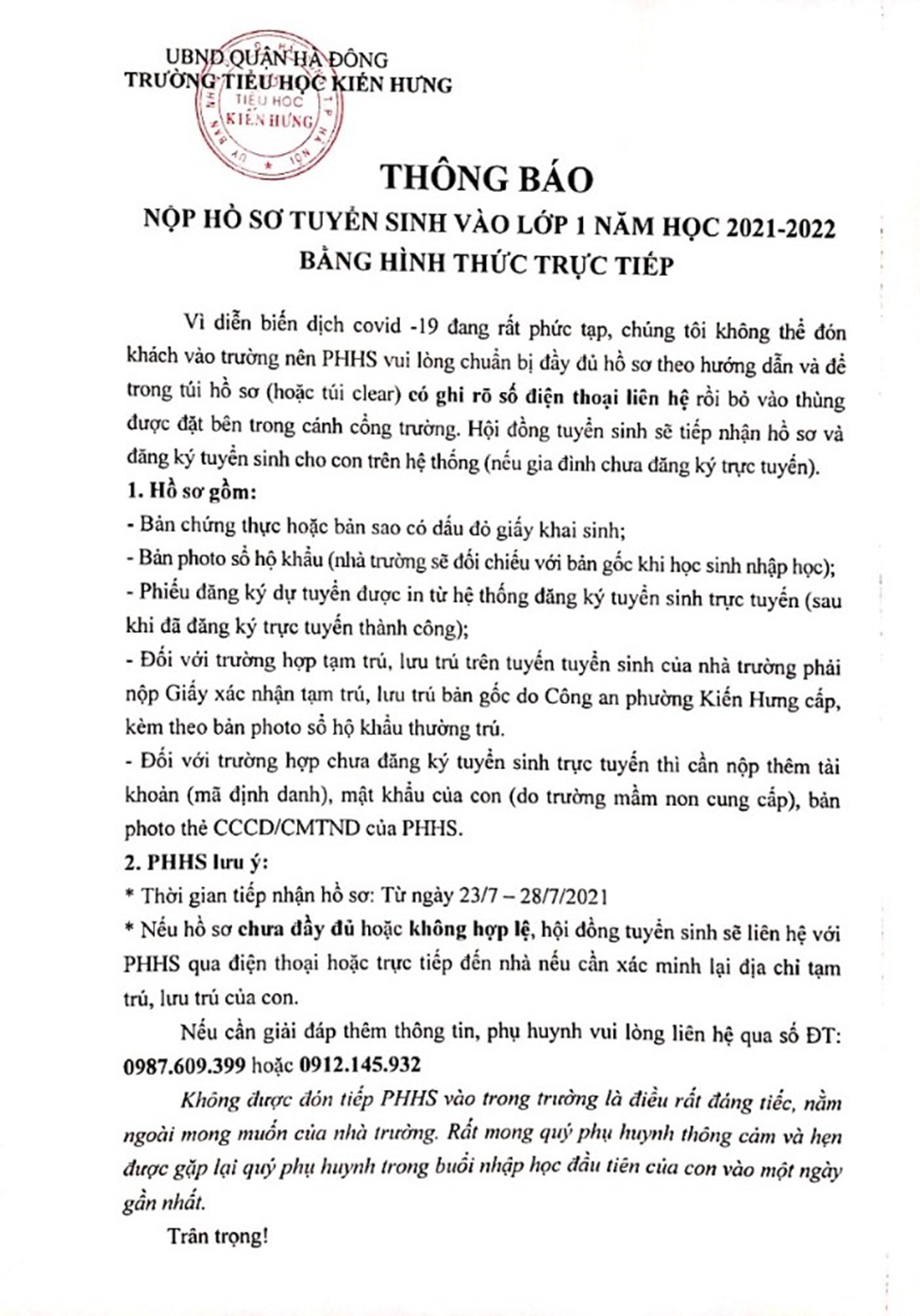 Thông báo nộp hồ sơ tuyển sinh vào lớp 1 năm học 2021-2022 bằng hình thức trực tiếp của trường Tiểu học Kiến Hưng.